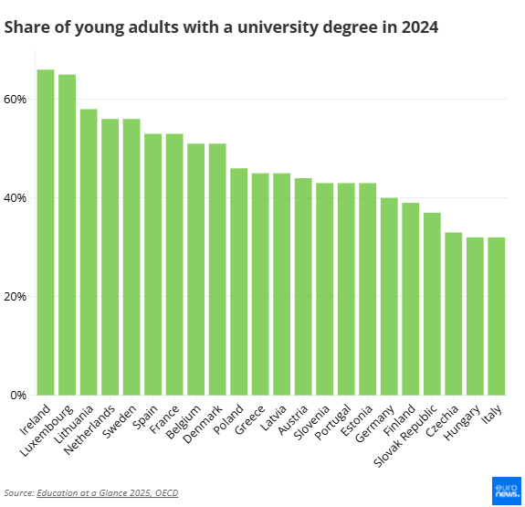 Η Ιρλανδία είναι η χώρα με τους περισσότερους πτυχιούχους πανεπιστημίου με ποσοστό 66%. Στην Ελλάδα, το ποσοστό των νέων ηλικίας 25 έως 34 ετών που διαθέτουν πτυχίο τριτοβάθμιας εκπαίδευσης ανέρχεται στο 45%, σύμφωνα με την πρόσφατη έκθεση του ΟΟΣΑ και είναι πάνω από το μέσο όρο της Ευρωπαϊκής Ένωσης.