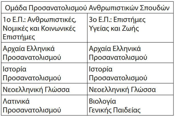 αα) Τα κοινά μαθήματα στα οποία εξετάζονται υποχρεωτικά οι μαθητές της Ομάδας Προσανατολισμού Ανθρωπιστικών Σπουδών, σε όποιο Επιστημονικό Πεδίο κι αν κατευθύνονται, είναι τα εξής τρία (3): τα Αρχαία Ελληνικά Ομάδας Προσανατολισμού, η Ιστορία Ομάδας Προσανατολισμού και η Νεοελληνική Γλώσσα (Γενικής Παιδείας).