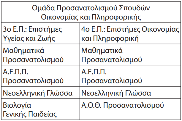 αα) Τα κοινά μαθήματα, στα οποία εξετάζονται υποχρεωτικά οι μαθητές της Ομάδας Προσανατολισμού Σπουδών Οικονομίας και Πληροφορικής, σε όποιο Επιστημονικό Πεδίο κι αν κατευθύνονται, είναι τα εξής τρία (3): τα Μαθηματικά Ομάδας Προσανατολισμού, η Ανάπτυξη Εφαρμογών σε Προγραμματιστικό Περιβάλλον (ΑΕΠΠ) και η Νεοελληνική Γλώσσα (Γενικής Παιδείας).