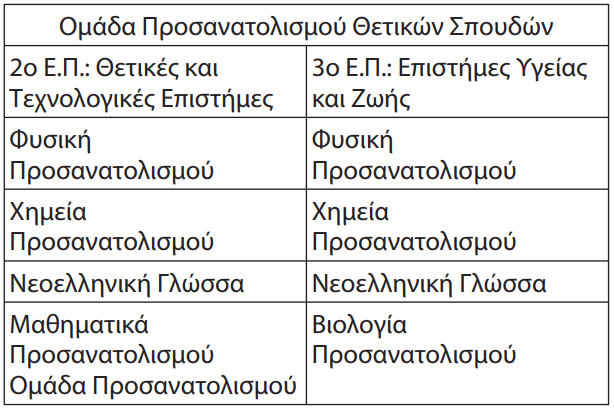 αα) Τα κοινά μαθήματα, στα οποία εξετάζονται υποχρεωτικά οι μαθητές της Ομάδας Προσανατολισμού Θετικών Σπουδών, σε όποιο Επιστημονικό Πεδίο κι αν κατευθύνονται, είναι τα εξής τρία (3): η Φυσική Ομάδας Προσανατολισμού, η Χημεία Ομάδας Προσανατολισμού και η Νεοελληνική Γλώσσα (Γενικής Παιδείας).